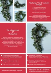 We gaan weer richting de kerst! De winkels liggen alweer vol met kerstspullen. Dat betekent extra gezelligheid in huis. Genieten van mooie groenstukken met dennentakken en lichtjes. We hebben een datum voor een gezellige workshop voor de Kerst. Het stuk zal bestaan uit verschillende groenmaterialen inclusief lampjes. U kunt dit stuk neerleggen of ophangen. Zoals andere jaren heeft U de mogelijkheid om de workshop te volgen in onze winkel of thuis te maken met de thuisworkshop. Zie voor de mogelijkheden de flyer in de bijlage. Uiteraard krijgt u van ons ook een lekker kopje koffie/thee en wat lekkers erbij als u de workshop in de winkel volgt.